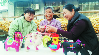 单县徐寨镇许集村年逾古稀的村民张素梅是大伙儿啧啧称赞的“针线活能手”。张素梅自幼酷爱传统织绣技艺,其制作的公鸡、骆驼、马、猪等布艺玩偶形象生动、新颖可爱,颇受大家的喜爱。“这都是老辈儿留下来的老手艺,我要传承下去,不能丢。”张素梅说。图为张素梅向村民传授玩偶制作技艺。