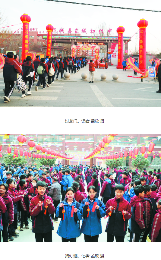 当日,郓城县东城中学的老师们身穿传统服饰早早来到学校,为即将返校的学子们准备惊喜。学校大门张灯结彩,有“龙腾盛世”字样的龙门耸立,旁边彩带龙飞舞,鼓声铿锵。校园内,一个个系着谜题的红灯笼悬挂在教学楼前,谜面涵盖了各种知识领域。同学们积极参与,兴致勃勃地围在灯笼下,或独自思考,或相互讨论,努力解开谜题。