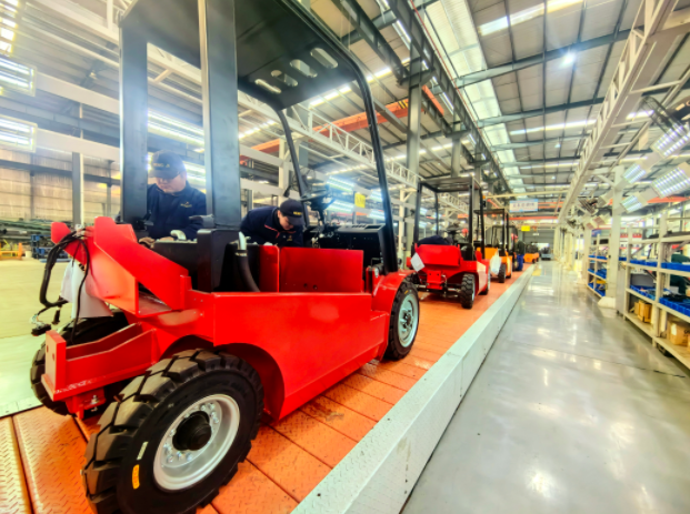 2月26日,位于郓城县的山东恒基集团股份有限公司智能电动叉车装配生产线上,工人正在对车辆进行检查。据悉,该公司是一家国家级高新技术企业,主要生产叉车及工程机械零部件,是中联重科、三一集团、山重建机等国内工程机械龙头企业的重要合作商。近年来,该企业加大技改力度,淘汰落后设备,通过引进智能化设备,变制造为“智造”。目前,年产值达到10亿元左右。