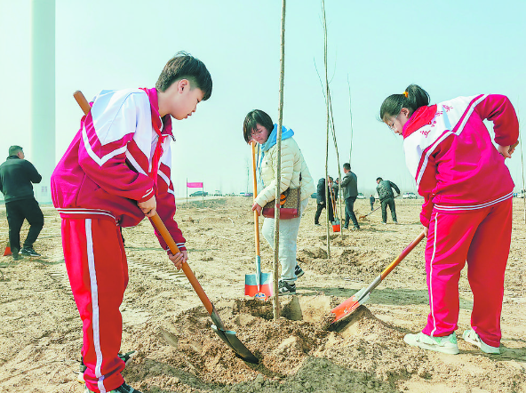 3月12日,东明县第二实验小学学生在国有东明林场栽种下一棵棵树苗,为土地增添新绿。