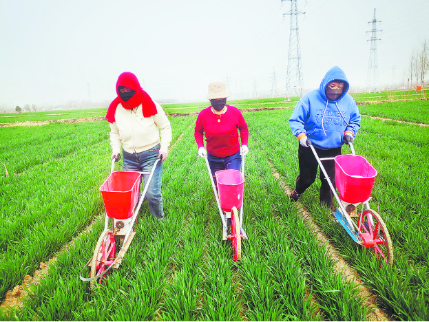 当前,小麦开始返青,进入生长的关键期,东明县小井镇抓住有利时机开展春耕春管工作。在绿油油的麦田里,农民们忙着浇水、施肥、除草……处处是一派忙碌的春耕景象。图为小井镇洼刘村村民在给小麦施肥。