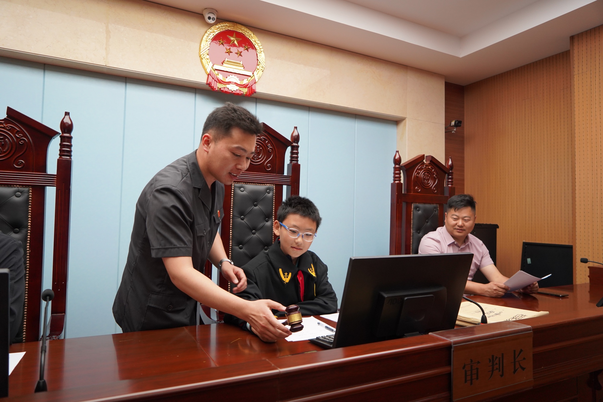 为树立青少年的法律意识和法治观念,切实维护未成年人合法权益,近日,成武法院邀请部分学生走进法院,让他们“沉浸式”体验法院工作,“零距离”感受司法权威。在参观刑事审判庭时,法官助理详细介绍了法徽、法袍、法槌等法律元素的含义,举例说明了法官、人民陪审员、书记员、公诉人、辩护人等角色在庭审中的不同作用。
