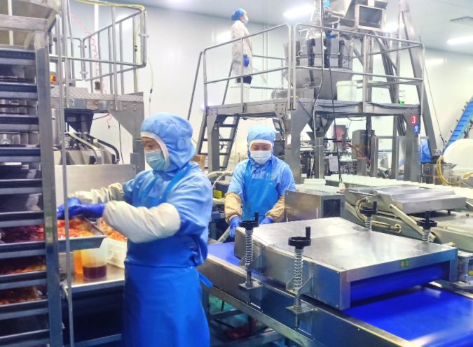 5月19日,浩林食品(山东)有限公司工人正在生产车间忙碌。据悉,该公司是成武县“百亿级”食品加工产业链条的核心企业,主要生产脱骨鸡爪、腊八蒜、脱骨鸭掌等休闲食品。近年来,我市不断壮大食品加工产业集群,初步形成果蔬、肉类、面点、预制菜4大门类600余个农产品加工品种。目前,全市规模以上农副产品加工企业占全市规上企业总数的50%以上,有农业产业化国家重点龙头企业6家,省级重点龙头企业68家。