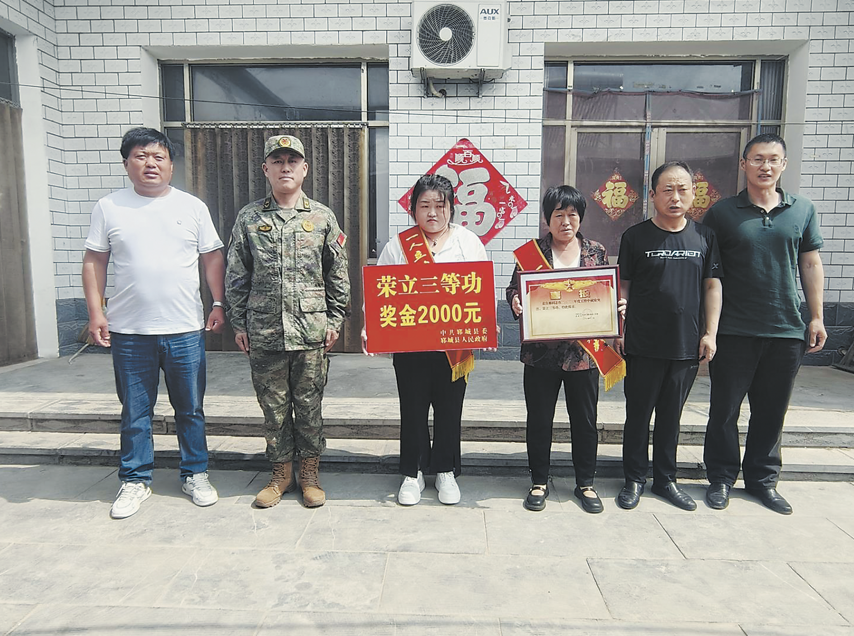 5月22日,郓城县退役军人事务局、杨庄集镇人武部、杨庄集镇退役军人服务站相关负责同志,为杨庄集镇荣立三等功的现役军人袁良栋的家属送去喜报,并感谢他们对国防事业的支持和贡献。