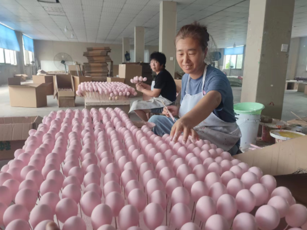 近日,单县谢集镇三里庄村的一处生产车间内,村民正在制作彩球。