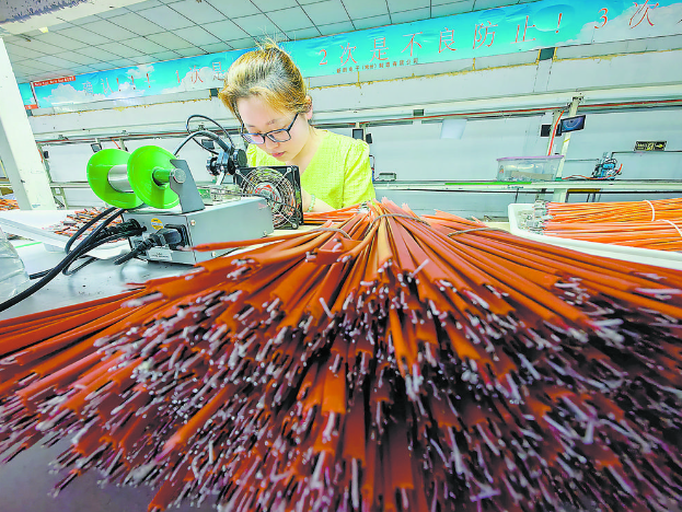 日前,在牡丹区高庄镇畅讯智能科技有限公司生产车间,工人加工连接线。该公司为消费电子产品、通信设备、安防设备等企业订单设计、生产、销售以信号传输、电源传输为主的各类Cable组件,目前已带动当地100余名村民就业。近年来,高庄镇加大招商引资力度,一批项目建成投产,成为当地经济社会发展的新动能。