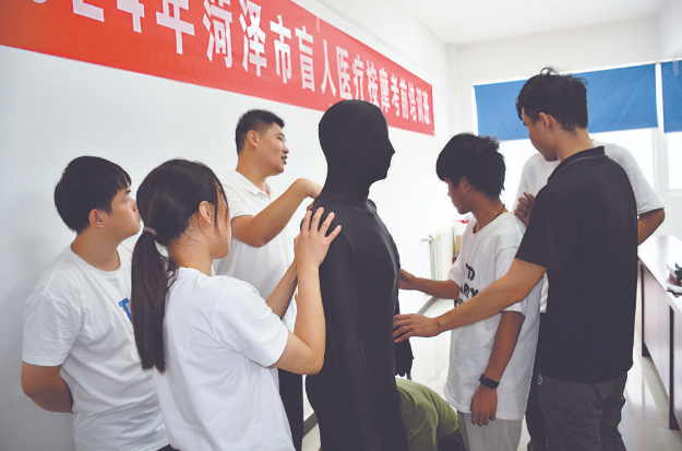 “这是背后大椎穴,顺着再往下是肺俞穴,你们按着这里往下摸,感受穴位的位置。”8月27日,2024年菏泽市盲人医疗按摩考前培训班在定陶区开班,授课老师使用人体经络腧穴仪为参加2024年全国盲人医疗按摩考试的学员们进行授课。