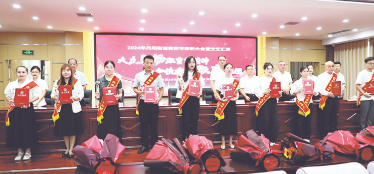 9月8日,菏泽鲁西新区丹阳街道举行2024年教师节表彰大会,向辛勤耕耘在教育战线的广大教育工作者致以节日的问候,表彰在丹阳街道教育事业中取得成绩的先进个人与集体。随后,辖区学校的师生们用精彩的节目表达了对广大教育工作者的感恩之情和崇高敬意,展现了新时代人民教师的使命担当和良好风尚,进一步激励和鼓舞广大教育工作者坚定理想信念、不忘初心使命,为教育事业贡献智慧和力量。