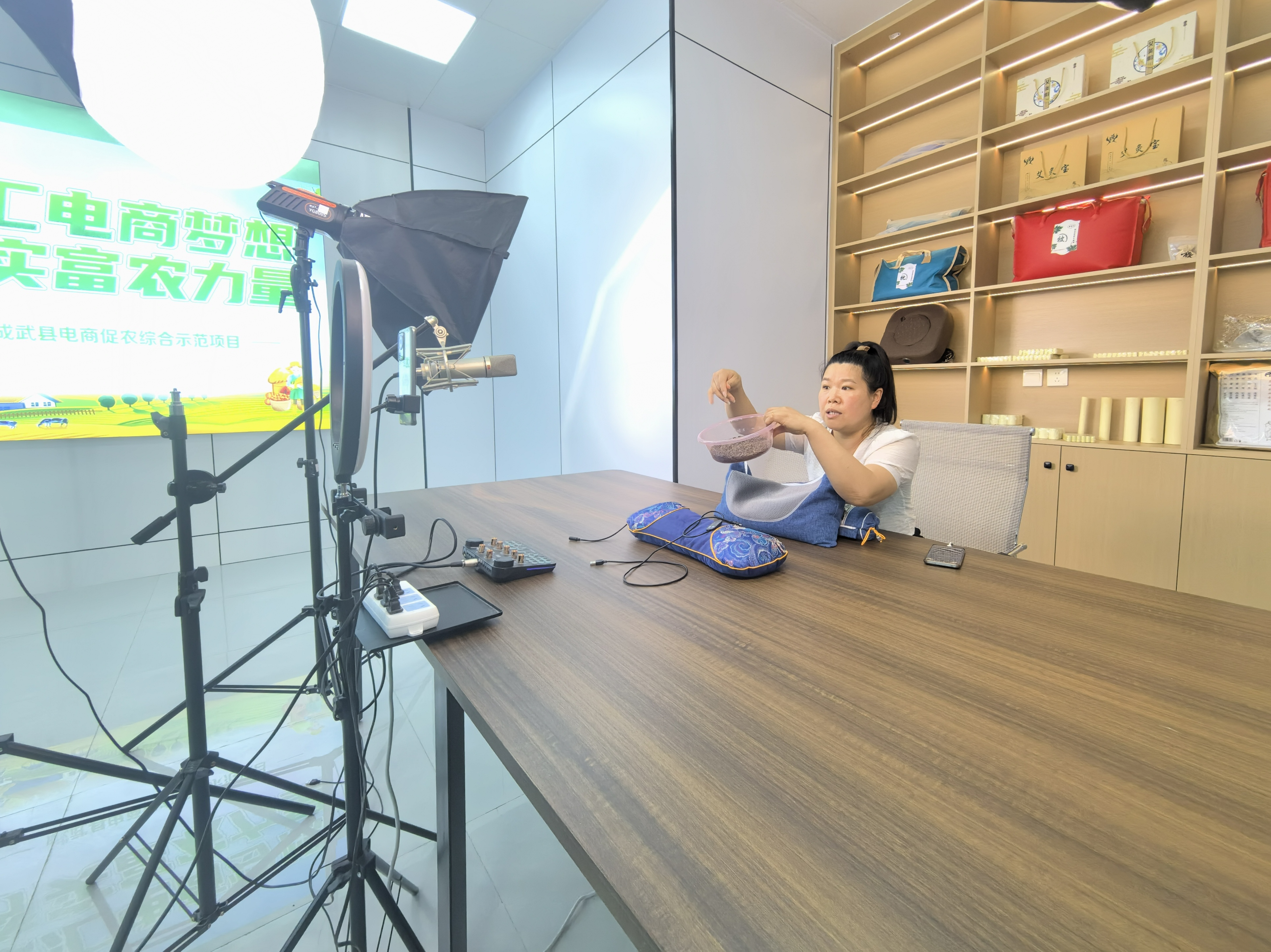 近日,在成武县汶上集镇秦田庄村新时代文明实践站,本地“网红村播”正在为网友介绍当地特色农副加工产品。近年来,当地政府通过政策支持,在部分村(社区)专门设置网络直播间,培养有直播兴趣的村民化身“网络主播”,为农产品代言,通过直播带货,让“土货”变“俏货”,实现精准销售,带动村集体经济和村民实现双增收,助力乡村振兴。