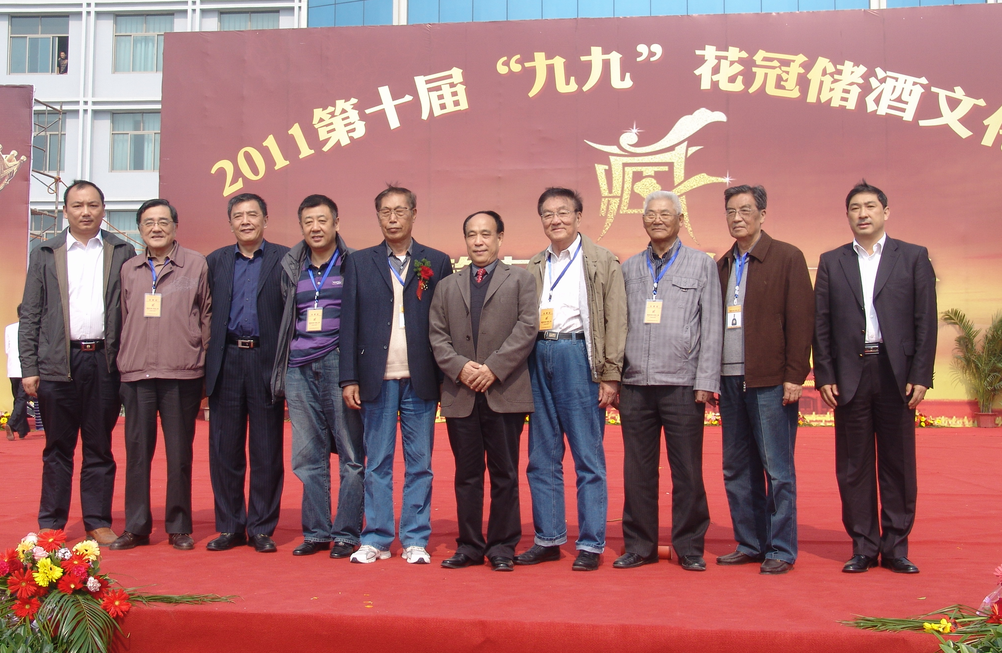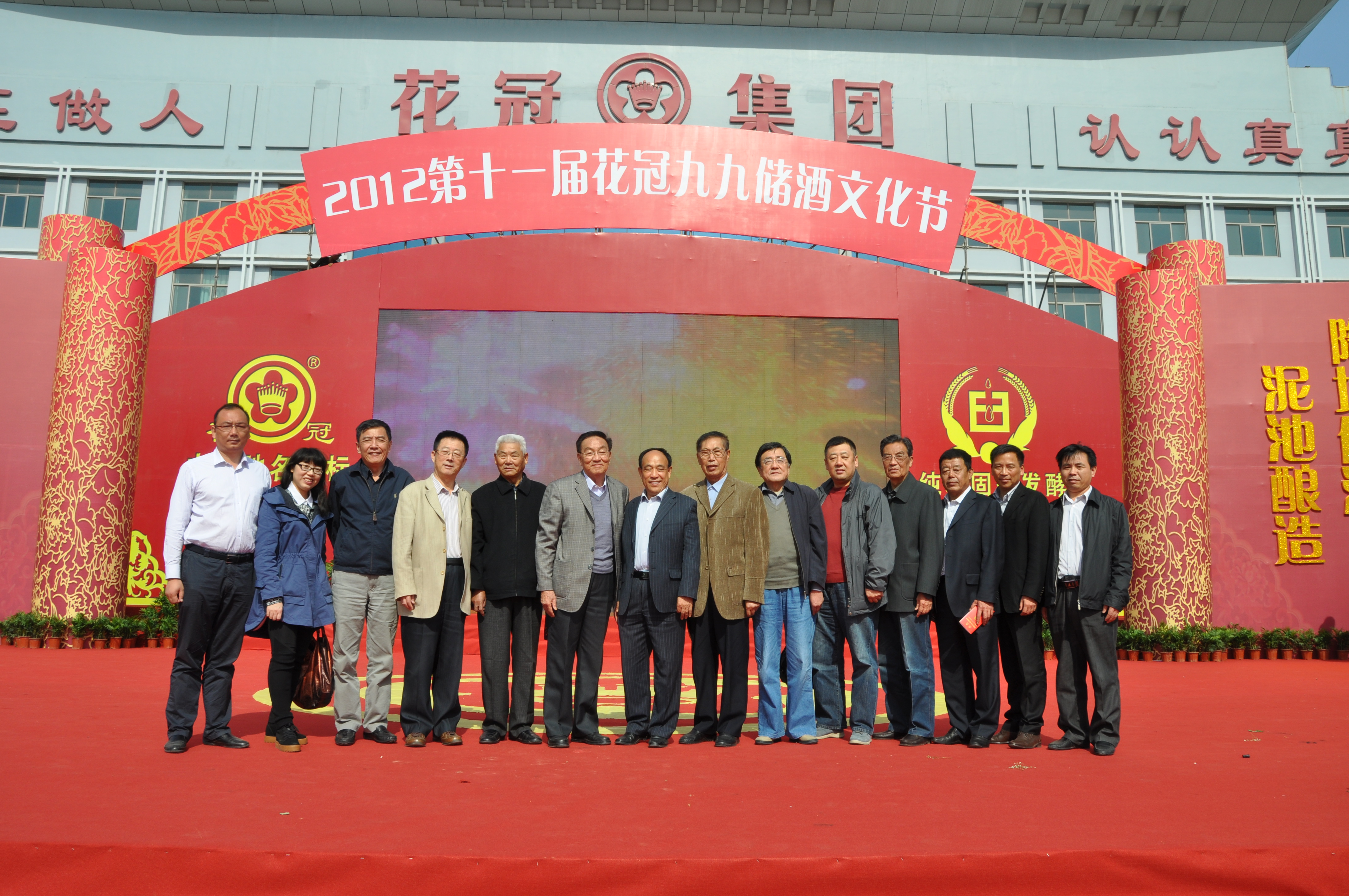 在2012第十一届“九九”花冠储酒文化节开幕式上,全国芝麻香型白酒分技术委员会副主任、花冠集团董事长刘法来,总经理刘念波与参加开幕式的省市领导、白酒专家合影.jpg
