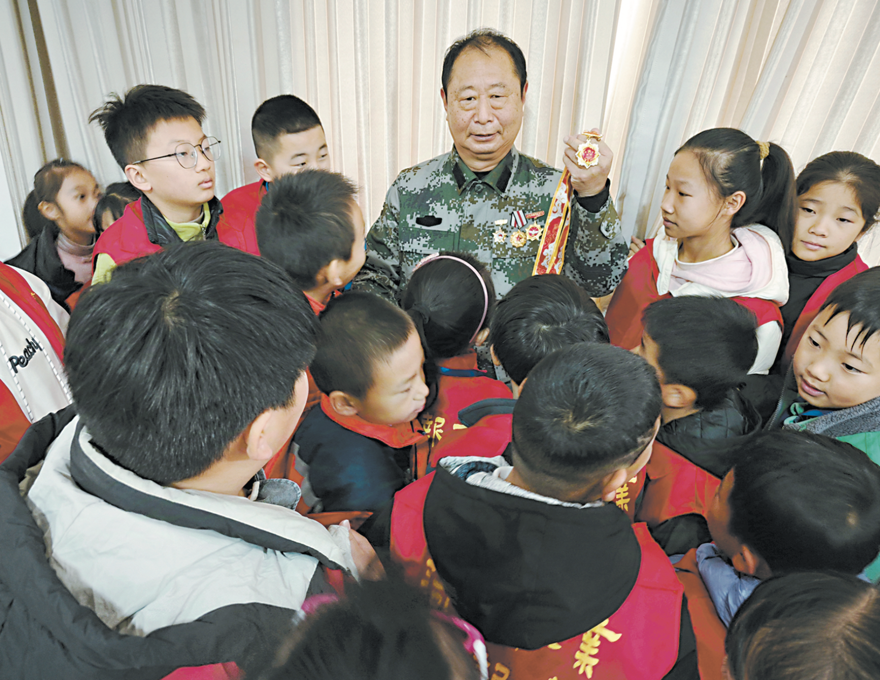 “我是重机枪手。敌人上来时,我的机枪子弹就像泼水一样扫向敌人。”当日上午,在山东御思酿酒有限公司六楼会议室,定陶区一等战斗功臣李继孔讲述了自己的战斗故事,以及定陶区15位烈士的英雄事迹。“战斗最艰苦时,我们猫在猫耳洞里,吃压缩干粮、喝山洞里滴下的水。”李继孔说,“一次战斗受伤,我头部缠着绷带,将所有的手榴弹拧开盖,所有的枪上膛,随时准备消灭敌人、牺牲自己。”他的精彩演讲赢得了100余名小记者及其家长的热烈掌声。