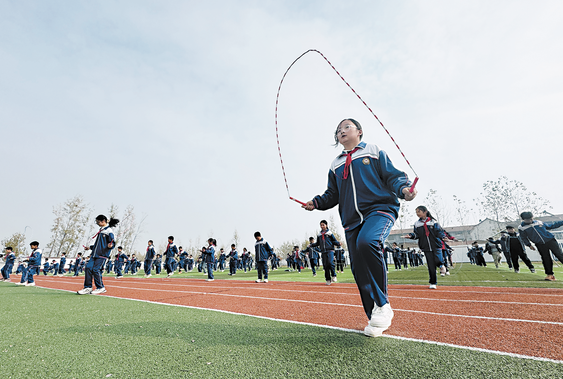 12月2日,在成武县九女集镇中心学校,学生们齐聚操场,共同跳起花样跳绳。