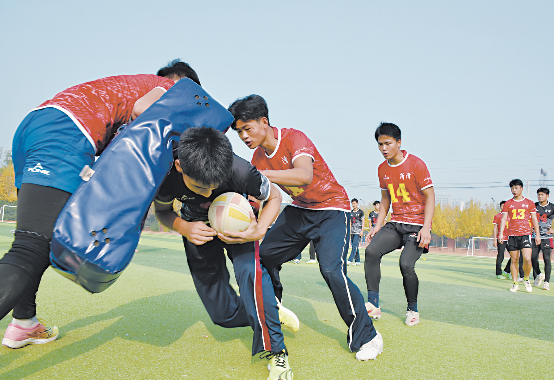 ▲12月2日,成武县第一中学的同学们在练习橄榄球项目中的撞击动作。