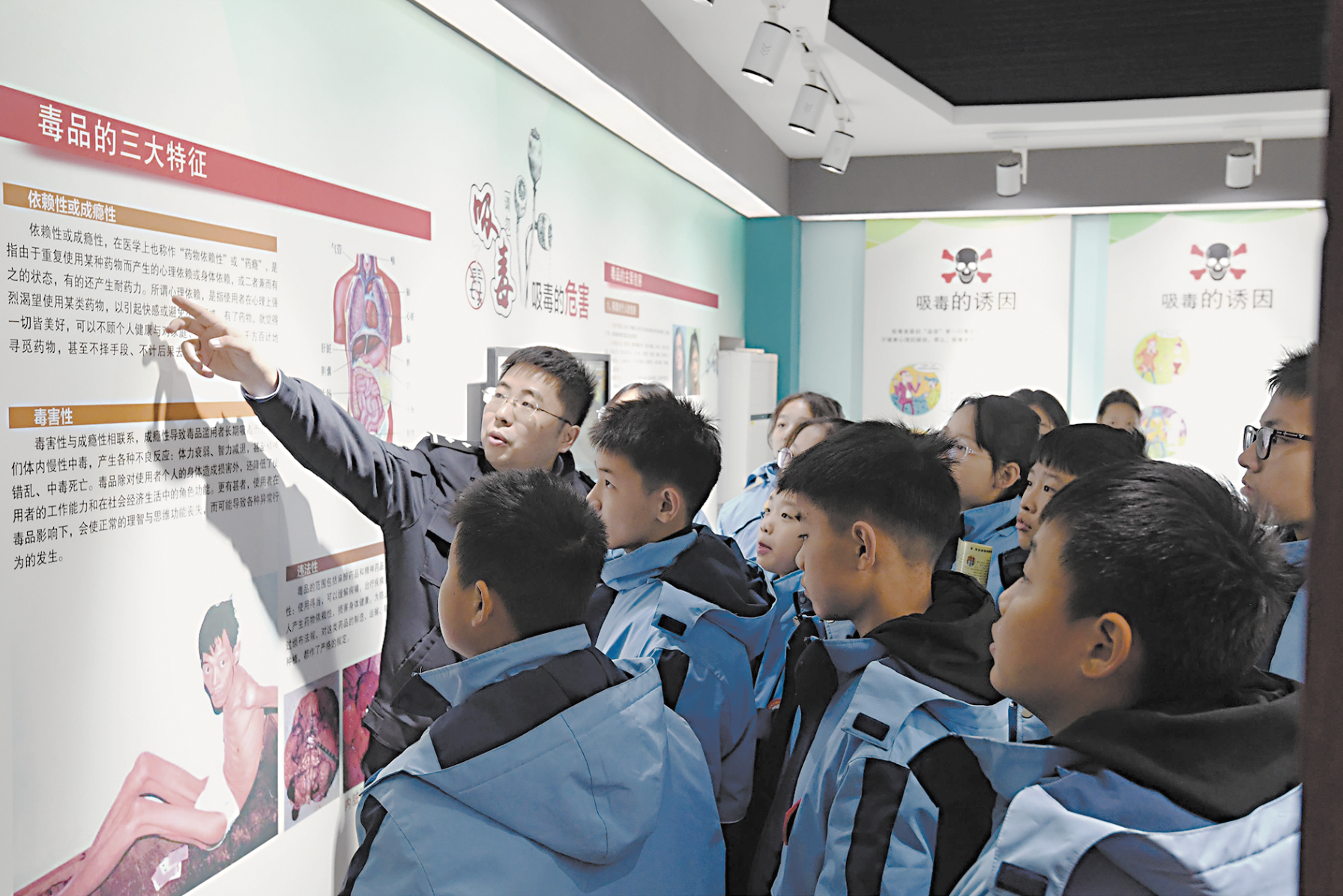在青少年法治教育基地,民警首先向在场学生普及宪法知识及中小学生应知道的法律小常识。民警结合办理的案件,向在场学生普及触犯治安法和刑法带来的法律后果,告诫在场学生法律神圣不可侵犯,培养学生基本法律意识,帮助学生树立守法观念。在禁毒教育基地,民警以大家学过的《鸦片战争》为切入点,从什么是毒品、常见的毒品有哪些、吸毒为什么会上瘾、吸毒有什么危害及青少年如何远离毒品五个方面,向大家详细普及毒品相关知识,并结合宣传单页及毒品仿真模型,帮助大家更好地认识毒品。