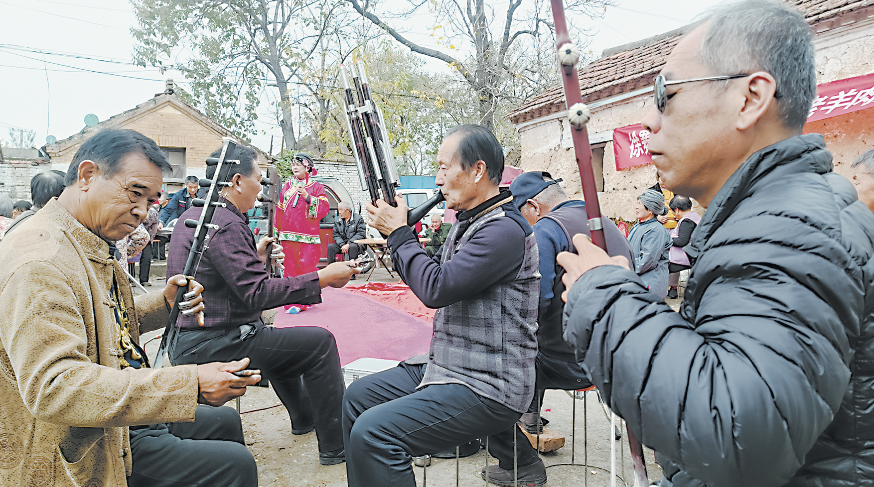 在徐寨镇丁楼村文体广场,寒意并没有降低“文化温度”,一群老年戏迷围成的“小舞台”,一套音响、一支架子鼓、一把方笙、两把二胡、五名演员,将民间传统戏曲柳琴《恶媳变孝媳》演绎得活灵活现,赢得笑声不休、掌声不断。“唱的都是俺农村事儿,俺喜欢听,不但不觉得冷,还感到很暖和!”王素芹老人说。