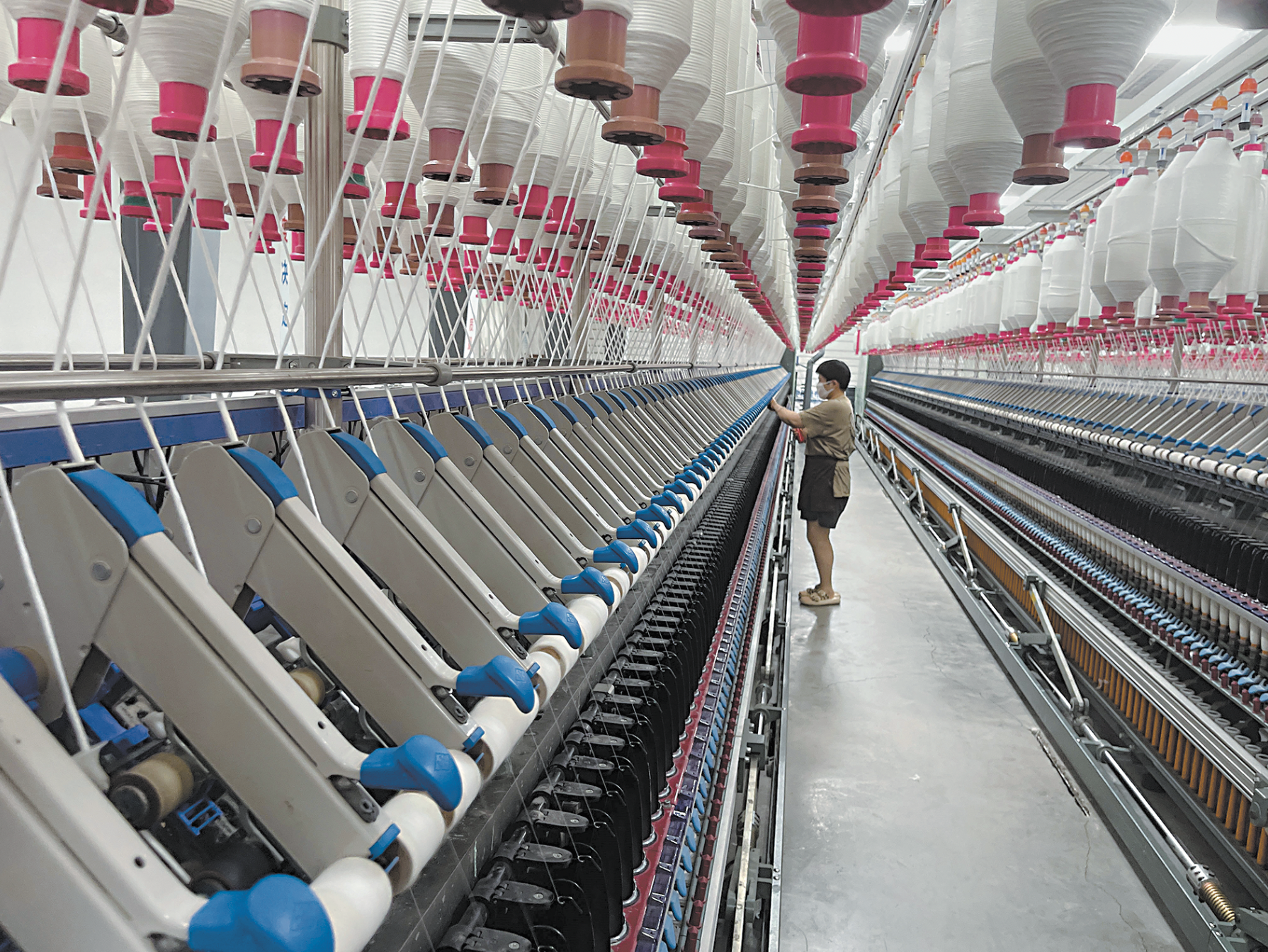 12月27日,曹县联纺纺织有限公司员工正在智能化纺纱车间工作。联纺纺织成立于2007年,以棉纱生产、加工、销售为主营业务。负责人纪恒介绍,2023年,公司投入1500万元进行智能化改造,引进先进设备100余台(套),棉纱年产量由之前的3000余吨增长为6000余吨,产品品质也得到有效提升。