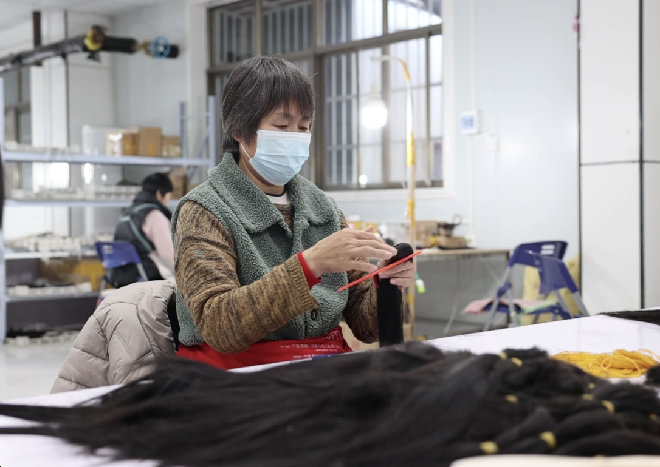 如今,创美发制品有限公司年销售额在4000万左右,年产量近30吨,不仅实现了企业的快速发展,还带动了周边村民在家门口就业增收,实现了企业与村民互利共赢。“我在这个厂工作六七年了,负责配货,忙完配货就去车间拉发,每个月工资七八千元,比外出打工强多了。”创美发制品有限公司员工刘晓敏说。
