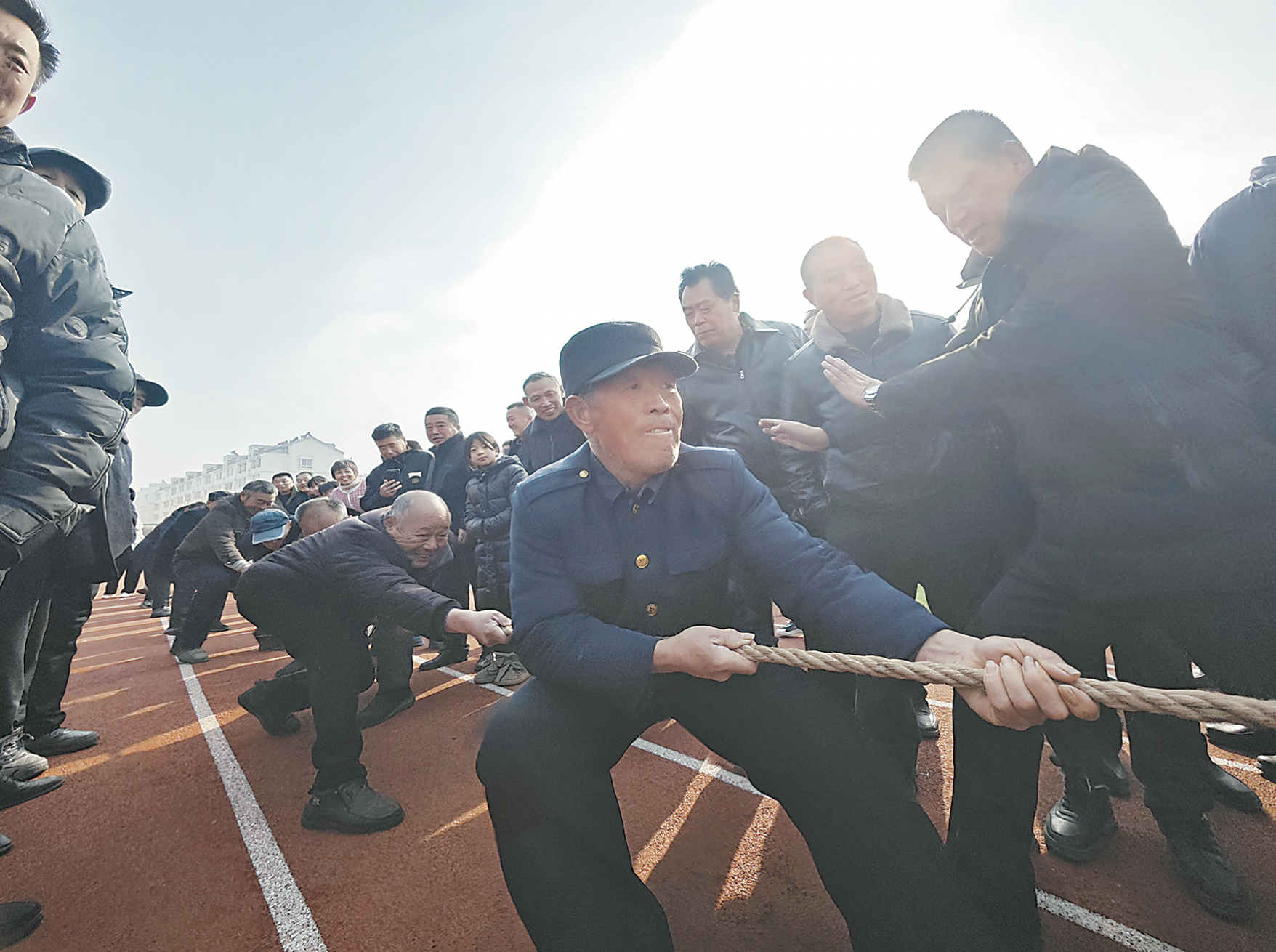 “我应该算今天年龄最大的运动员了,今年72岁了!”参赛选手毕新民向记者介绍,今天的拔河队伍是由毕北村里的“老头们”组成,队员的年龄在65岁以上。“平时种地练出的力气,今天全用在拔河上了。”毕新民笑着说。