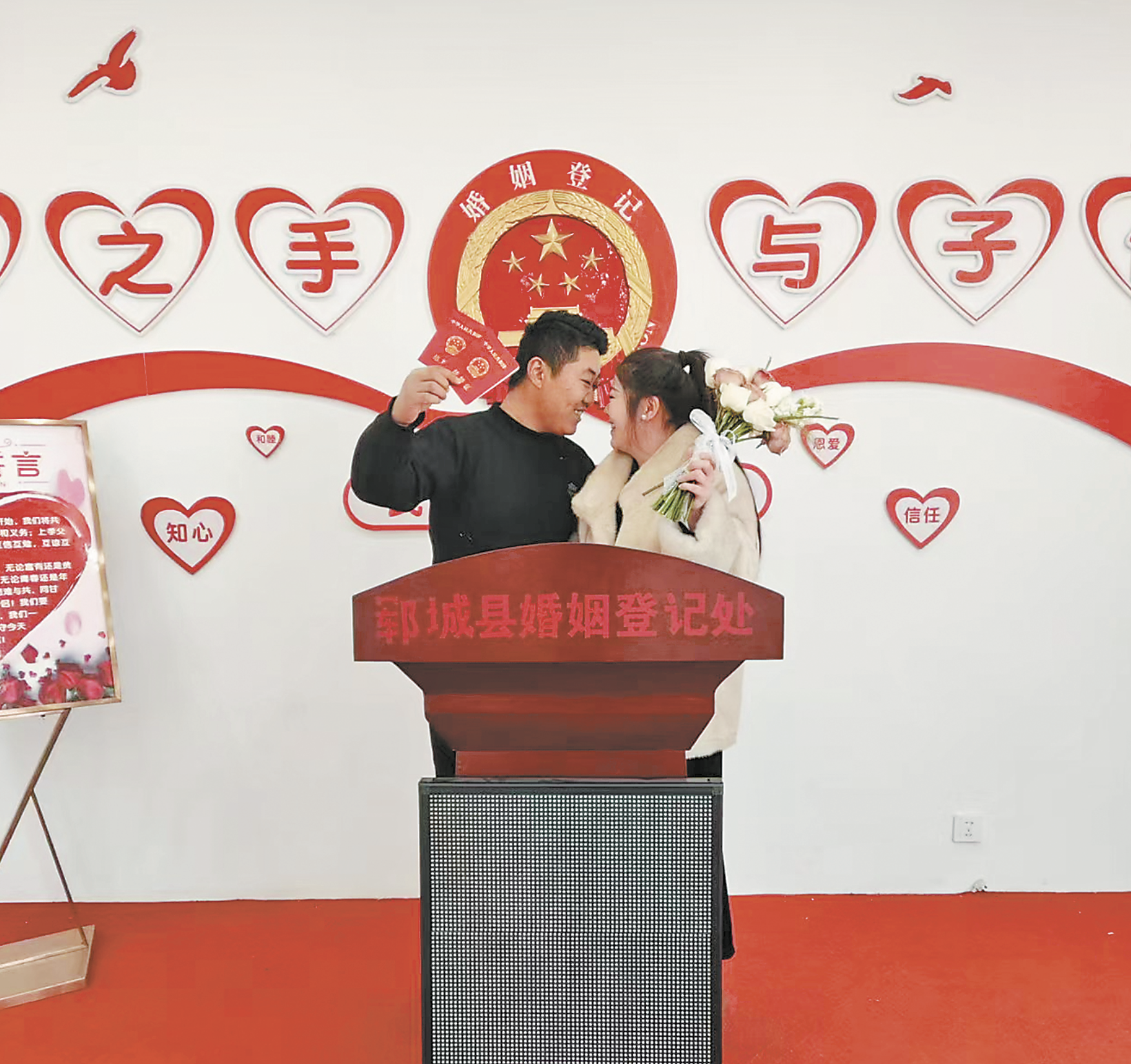 当天,郓城县婚姻登记处为新人们精心准备了中、西式颁证仪式。中式颁证仪式现场古色古香,大红的喜字、精美的屏风,伴随着悠扬的古典音乐,新人们郑重许下相伴一生的承诺。西式颁证仪式则营造出浪漫优雅的氛围,新人们在庄严的国旗、国徽下,深情许下爱的誓言。