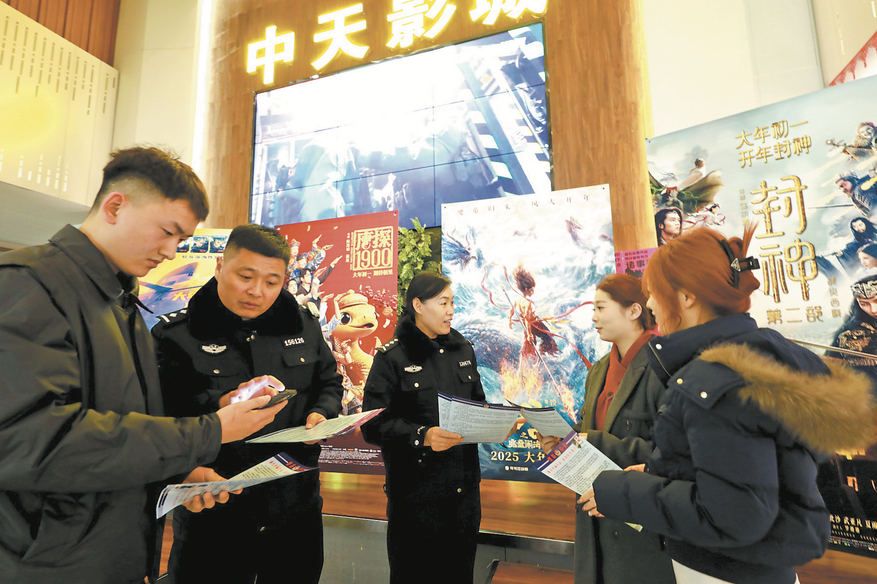 2月14日,曹县公安局曹城派出所民辅警深入辖区影院等娱乐场所开展反诈宣传活动,通过发放宣传资料和案例讲解等形式,向前来观看电影的群众宣讲反诈知识,增强群众的安全防范意识,提醒群众守护好自己的“袋子钱”。图为民辅警在辖区中天影院向群众开展防范电信网络诈骗宣传。