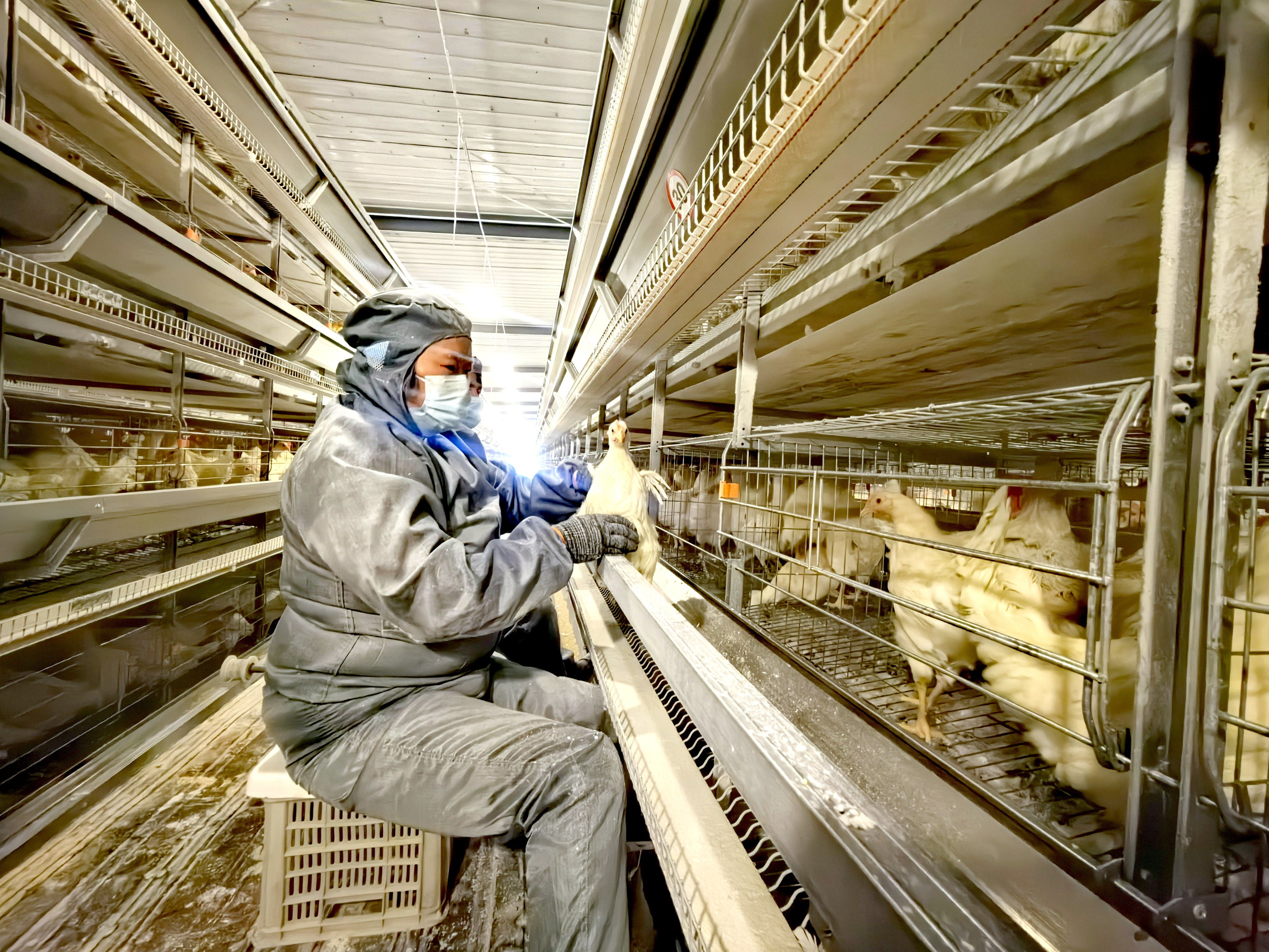 3月12日,牡丹区大黄集镇安陵村鸿展农牧有限公司智能化养鸡车间,工作人员正在给蛋鸡打疫苗。借助数字化力量,这家公司运用智能“大脑”驱动蛋鸡养殖新变革,43万只蛋鸡住进“数智宿舍”,温度、湿度、喂料、照明一键监控,产蛋率达96.4%。