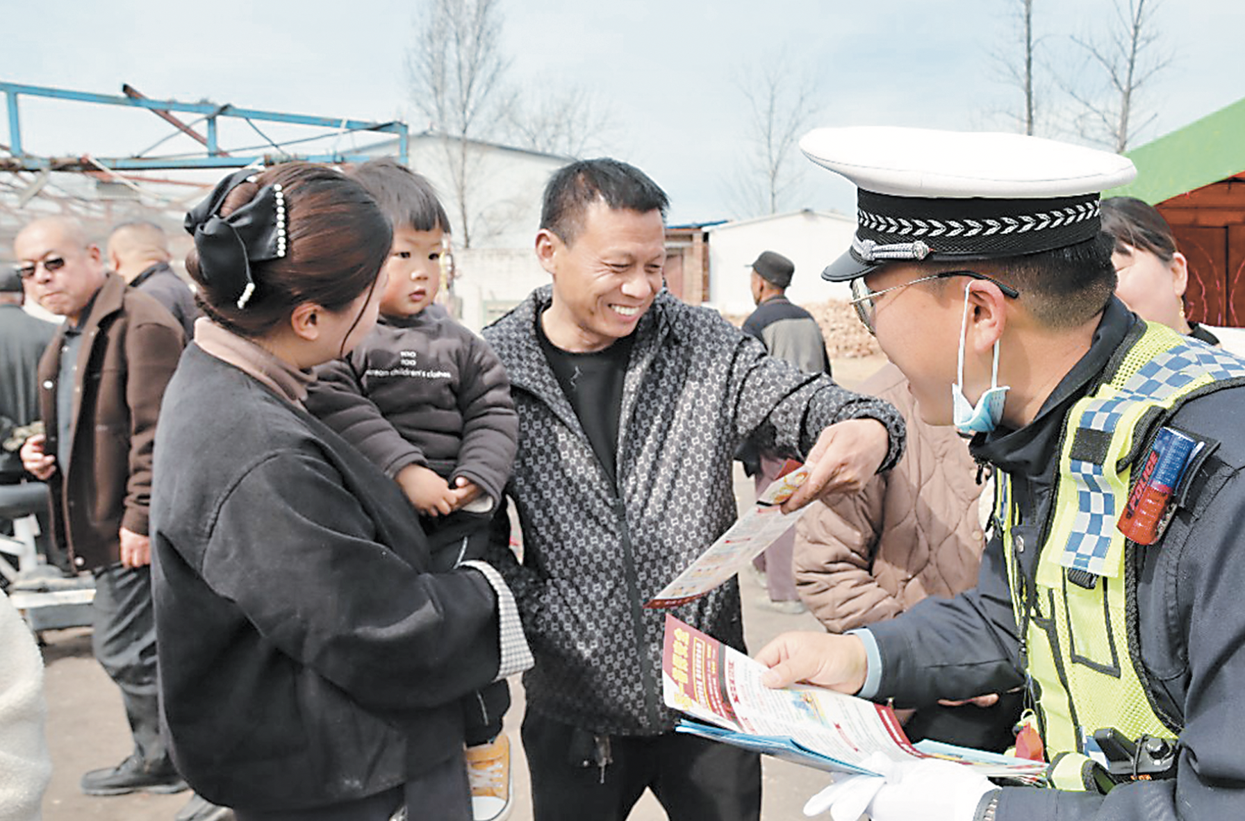 逛庙会、赏非遗、看大戏、品美食,3月15日,鄄城信义庙会民俗活动现场,人头攒动,热闹非凡。为提升群众的交通安全意识,预防和减少道路交通事故发生,鄄城县公安局交警大队抓住庙会人流量大的契机,组织民辅警深入庙会现场,开展交通安全宣传活动,为群众送上“安全大礼”。