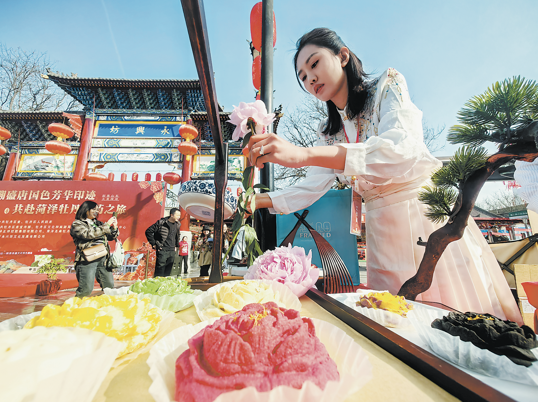3月23日,在陕西省西安市永兴坊景区,牡丹区工作人员整理牡丹展品。当日,牡丹区组织的“追溯盛唐国色芳华印迹 共赴菏泽牡丹芍药之旅”宣传推介活动走进西安。活动现场,牡丹食品、牡丹木雕、牡丹瓷、牡丹鲁锦、牡丹花蕊茶、牡丹面膜等一批产品各具特色,吸引着游客和当地市民仔细欣赏,对牡丹传统文化的深厚底蕴与牡丹文创的独特魅力赞叹不已。