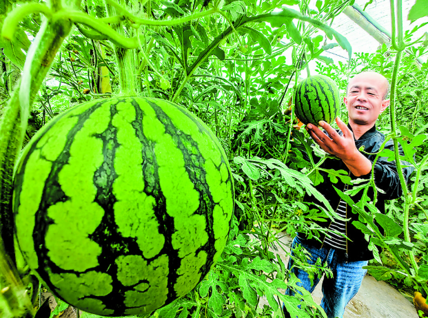 5月9日,在牡丹区吴店镇东方社区的一处西瓜种植基地,瓜农正在采摘成熟的彩虹西瓜。近年来,吴店镇大力发展设施农业、高新农业,聚焦彩虹西瓜、花美人甜瓜、优质葡萄等特色农产品,通过科技帮扶、示范引领、合作社发展等模式,带动越来越多的村民搭上了“致富快车”。