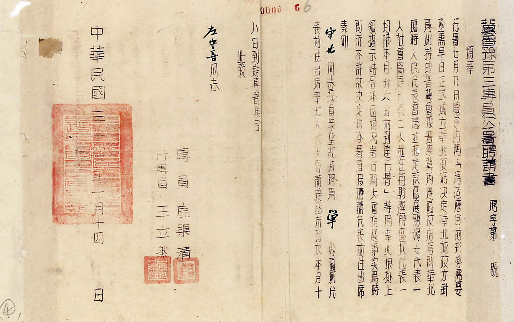 《聘请书》内容为:顷奉行署7月9日电令内开:“为适应目前形势需要,亟须早日正式成立华北政府,决定华北施政方针,为此,特由晋冀鲁豫、晋察冀两边区政府筹开华北临时人民代表会议,并指定地区选聘妇女代表1人,社会贤达代表2人,并在每县选聘区域代表1人,均限本月26日前到达行署”。本因奉此,根据上级指示,结合本区情况后,召开大会推选,事实为时间所不许,故决定由本署直接聘请代表前往出席。秦仰、守北同志深孚众望,故聘为单县区域代表前往出席华北人代大会。请接函后务必于本月18日到达专署集合。