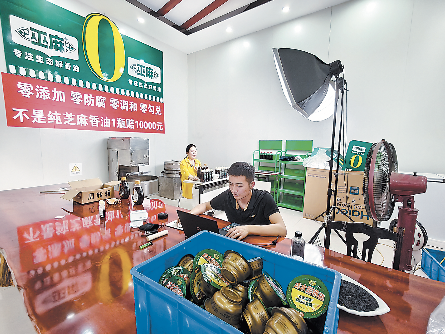 “我们生产的小磨香油秉承传统石磨工艺,经过筛选、清洗、炒籽、磨制、兑浆、沉淀、灌装、封口、贴标、装箱等十几道流程,每一步都严格把关。”公司负责人李国顺在直播间里向网友介绍道。