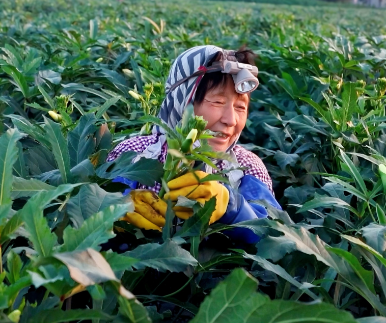 近日,在东明县武胜桥镇的秋葵种植基地,务工人员正在采摘成熟的秋葵。据了解,该秋葵种植基地占地约80亩,亩产量4000公斤左右,主要销往泰安、莱阳等地。秋葵的丰收不仅给种植户带来了经济收益,还带动了周边50余名群众就业增收,成了当地的富民产业。 记者 黄啟峰 摄