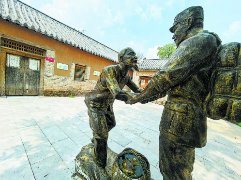 7月25日,牡丹晚报全媒体记者来到状元张楼村。75岁的村文物保护员兼义务讲解员张留振推开指挥部旧址大门,一座雕塑映入眼帘:一位老人紧握着一名背着行囊八路军战士的手,地上的篮子里装满生活物品,两人四目相对,眼中满是不舍。张留振说,这座雕塑再现的是当年八路军离开村子时,村民与战士们依依惜别的场景。随后,一个个动人的故事从他口中缓缓道出。