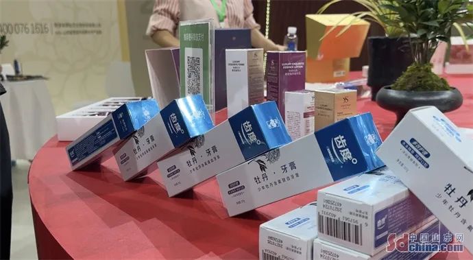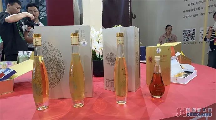 在菏泽尧舜牡丹、龙池牡丹等牡丹企业的牡丹产品展区内,展台上摆放着牡丹面膜、牡丹牙膏、牡丹籽油、牡丹气泡水等产品,来挑选牡丹产品的人络绎不绝。