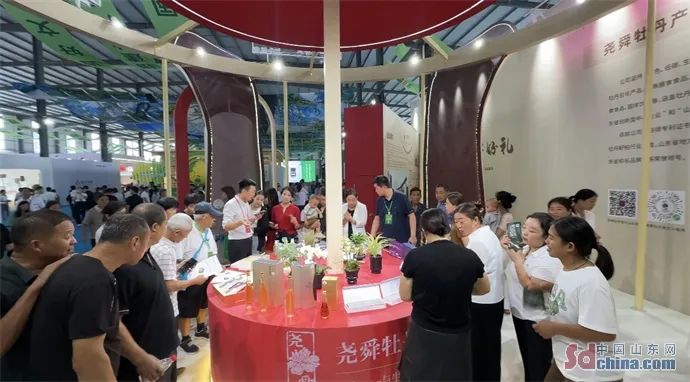 展会现场人潮如涌,在菏泽牡丹产品展区,色泽金黄的牡丹籽油、醇香甘甜的牡丹花蕊茶及牡丹日化产品吸引了众多嘉宾及客商的目光。