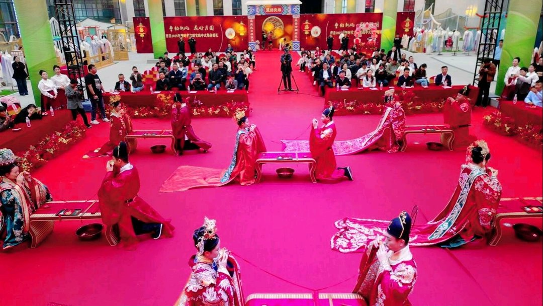 在曹县数字经济产业园,12对新人,伴随着悠扬的古典乐,脚踩红毯、依次入场。在现场全体人员的见证下,行感恩三拜礼、沃盥礼、合卺礼等传统礼仪,演绎千年风雅与浪漫。新人家长向新人传家训、致祝福,展现了简约而不失庄重、喜庆且充满温情的婚礼新风。