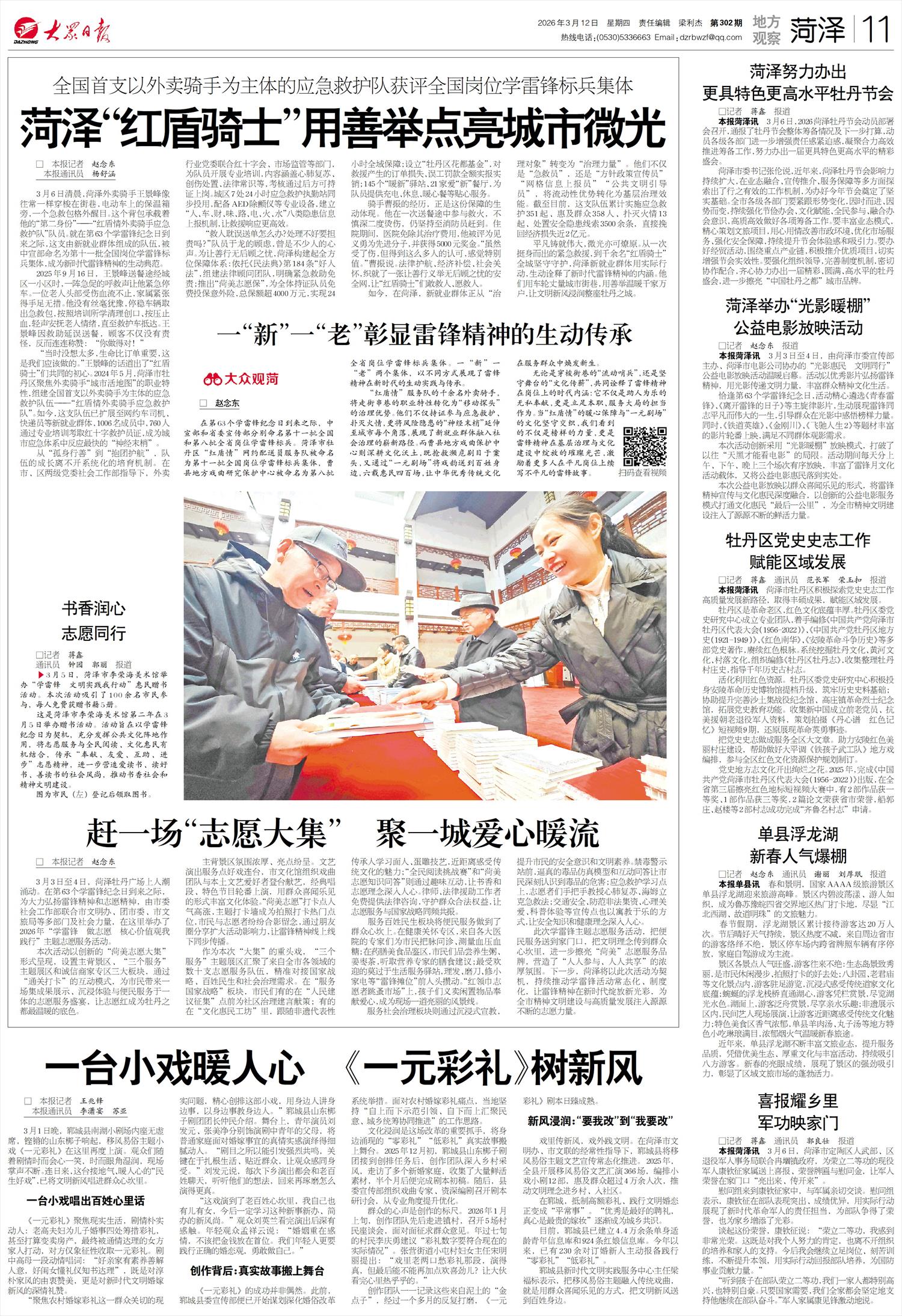 3月3日至4日,菏泽牡丹广场上人潮涌动。在第63个学雷锋纪念日到来之际,为大力弘扬雷锋精神和志愿精神,由市委社会工作部联合市文明办、团市委、市文旅局等多部门及社会力量,在这里举办了2026年“学雷锋 做志愿 核心价值观我践行”主题志愿服务活动。
