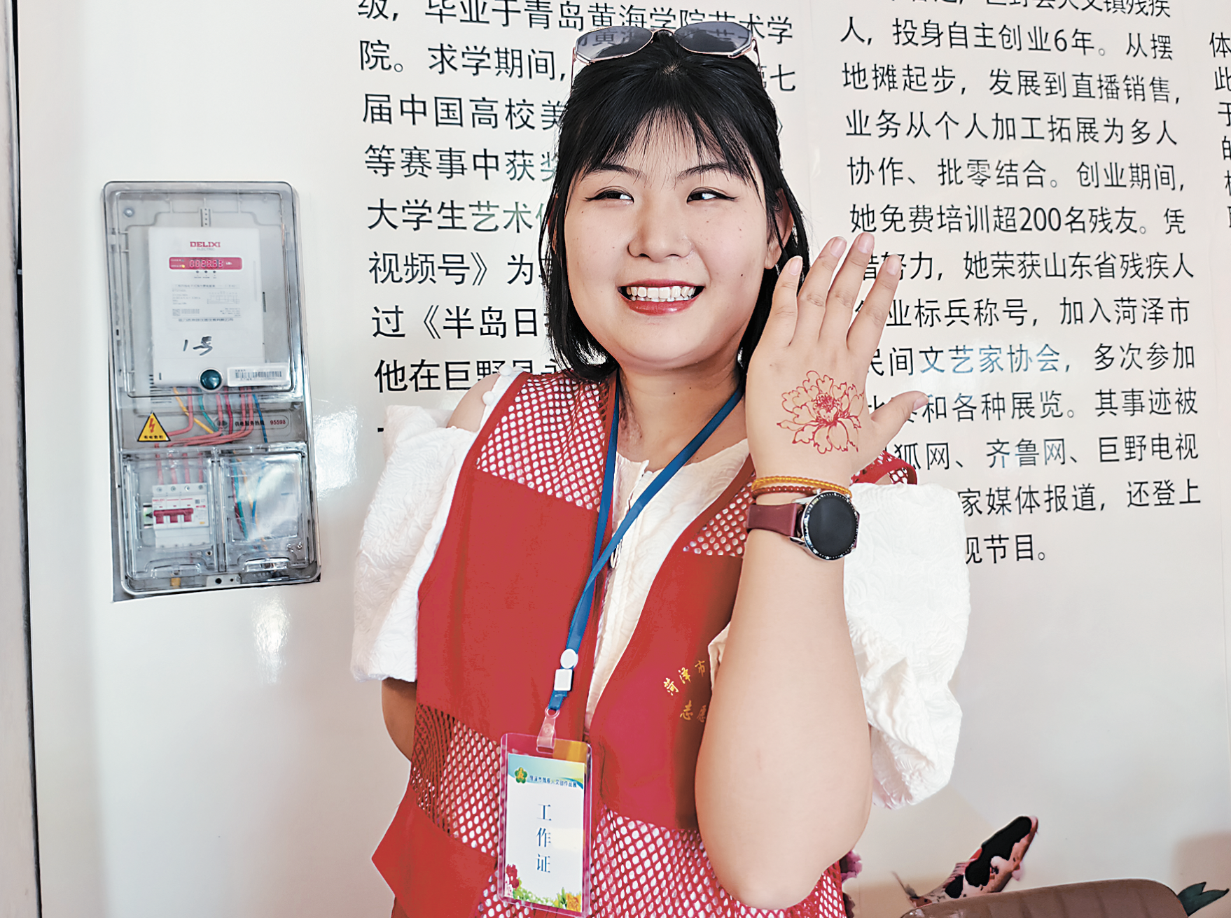 4月14日,在曹州牡丹园菏泽市残疾人文创作品展展厅内,来自巨野的姑娘姚伟伟,怀揣着对艺术炽热而执着的心,在海娜手绘领域大放光彩。她让娇艳欲滴、栩栩如生的牡丹,在游客手面上悄然“盛开”,展现出别样魅力。