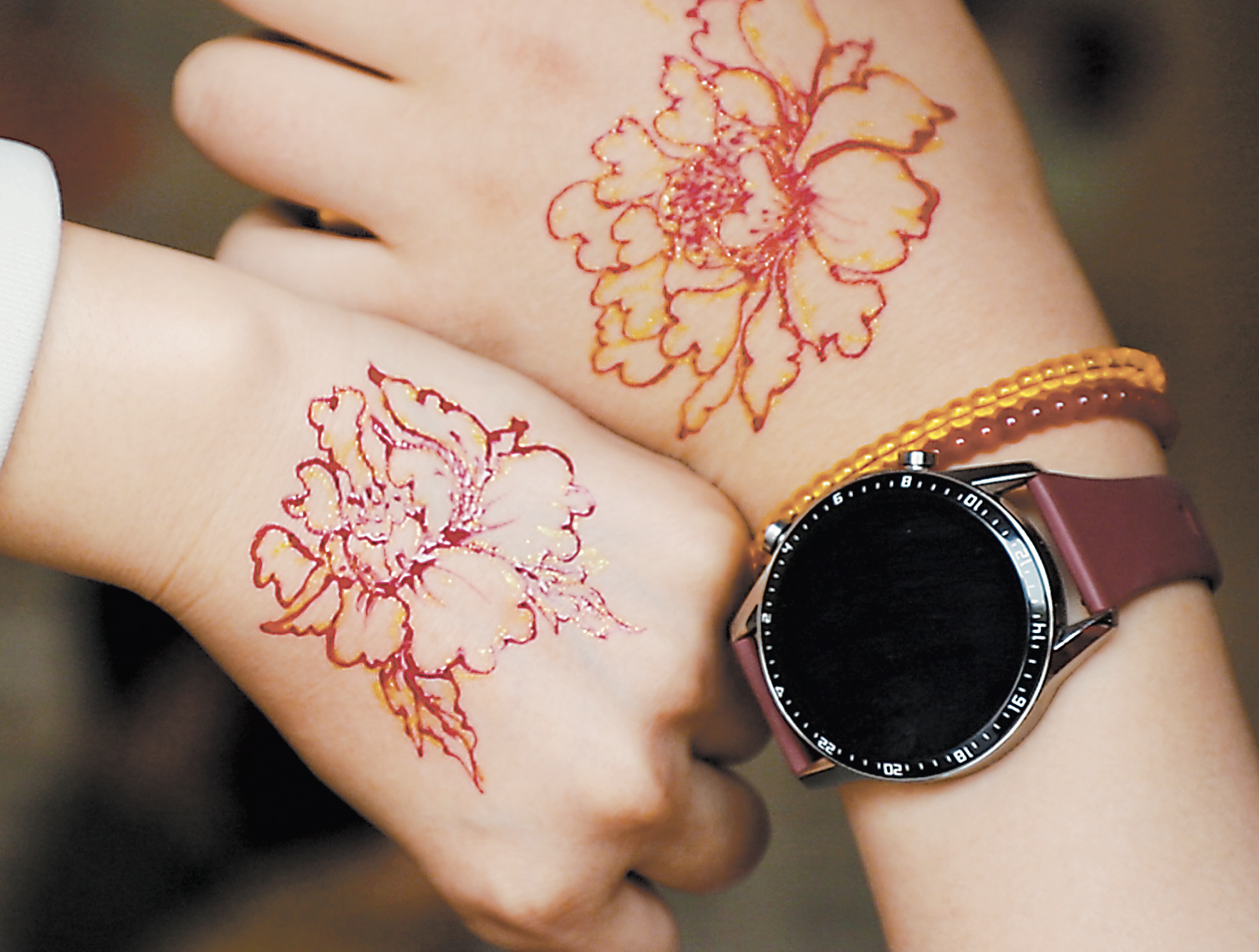 没过多久,一朵栩栩如生的牡丹便在游客手面上悄然“盛开”。游客们惊叹不已,纷纷举起手,欣赏这独特的艺术作品。