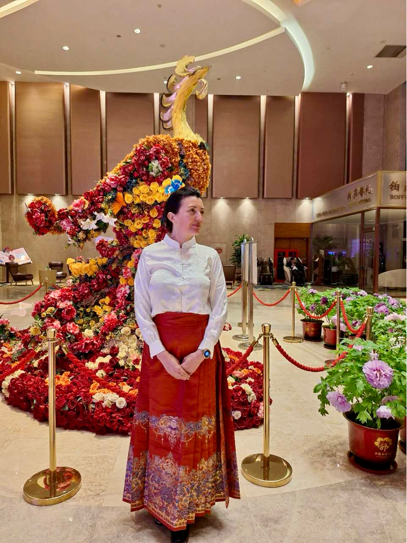 晚饭后,瓦塞娃换上主办方送来的牡丹汉服,沿着城市公园的步道散步。衣袂翩跹与金色卷发相映成趣,引得孩童争相合影。卖牡丹糕的摊主热情递上点心,文创摊前的少女细数产品背后的文化故事。“青石板上的裙摆声和此起彼伏的‘您好’,让我恍若回到保加利亚的玫瑰节……”瓦塞娃表示,这份跨越国界的温暖,恰如牡丹层层叠叠的花瓣,抚平异乡人的忐忑。