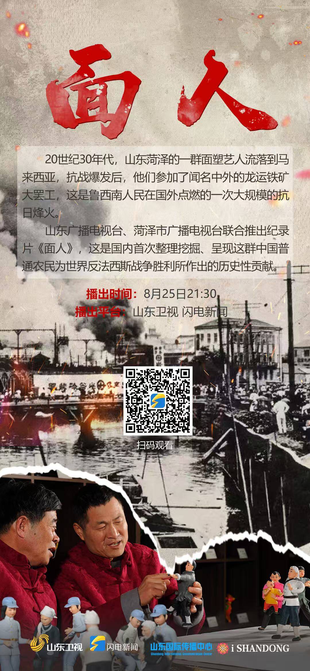 山东广播电视台、菏泽市广播电视台联合推出纪录片《面人》,这是国内首次整理挖掘、呈现这群中国普通农民为世界反法西斯战争胜利所做出的历史性贡献。 纪录片将于8月25日21时30分在山东卫视、闪电新闻客户端播出,敬请关注。