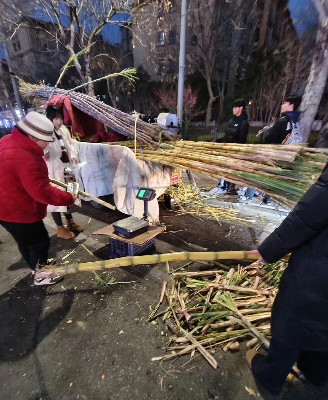 “昨晚来过,你已经收摊了,所以今天特意早点过来。”一位市民的话语,透着朴实的真诚。热心人纷纷伸出援手,有人默默接过张传站手中的砍刀,帮着砍甘蔗、称重、搬运。对面火锅店的员工,端来了热腾腾的开水和饭菜,让他暖手暖身,路过的商户主动帮忙吆喝,维持秩序。