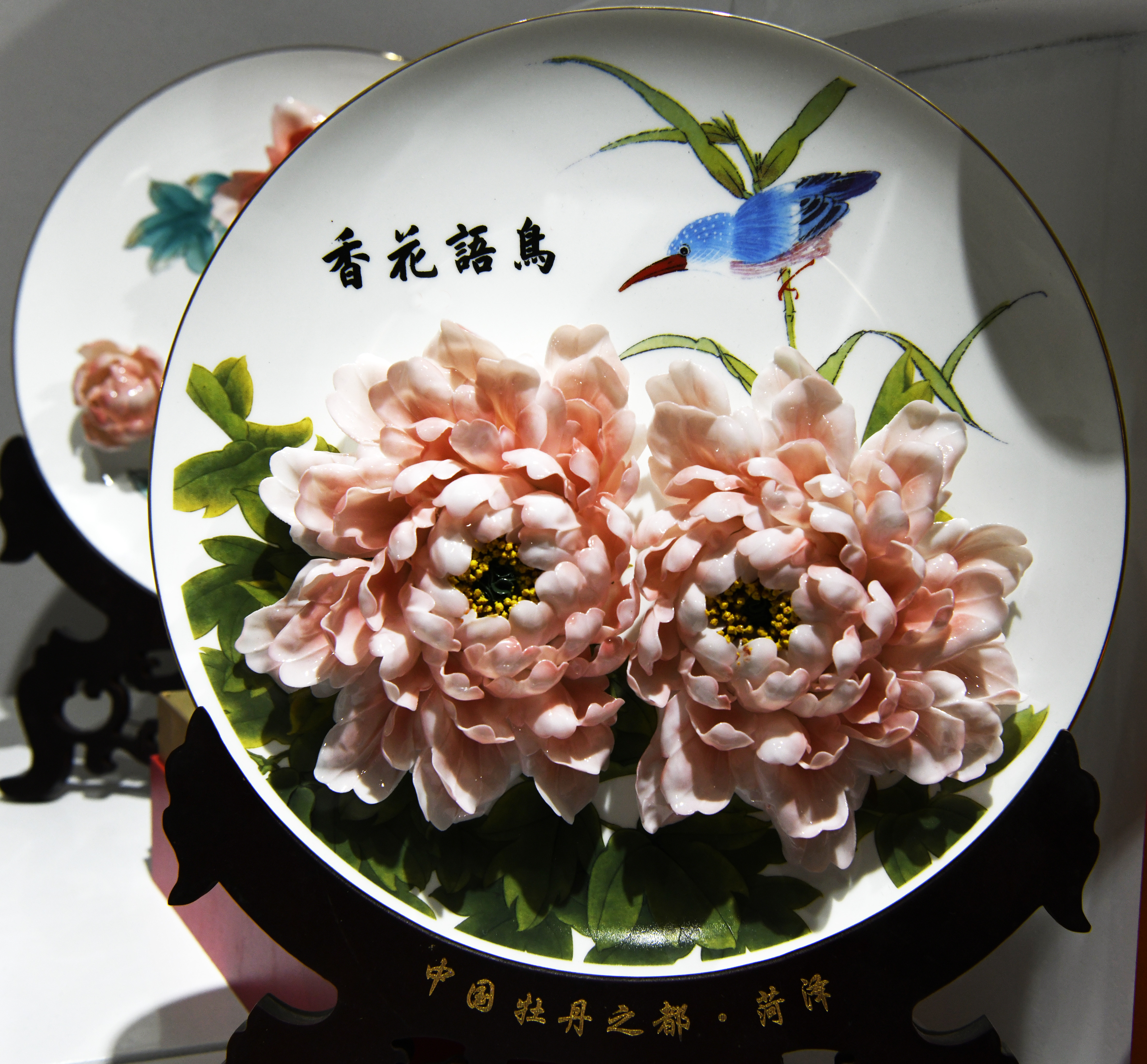牡丹文化的“破圈”不止于绘画。郓城剪纸传承人杨秀玲以刀代笔,剪出牡丹的雍容华贵;在吴店镇鹁鸽堂村,曹州刻瓷以瓷为“纸”,将牡丹风姿定格于盘盏之间;陆氏蛋雕第四代传人陆国强将菏泽“牡丹之都”的文化基因融入创作,其代表作《盛世牡丹》在鸵鸟蛋壳上雕刻108朵形态各异的牡丹……值得一提的是,2025年底,“时代芳华”牡丹主题中国画扇面作品展在北京亮相,菏泽牡丹走出花田,进入国家级艺术殿堂,成为社会美育的鲜活教材。