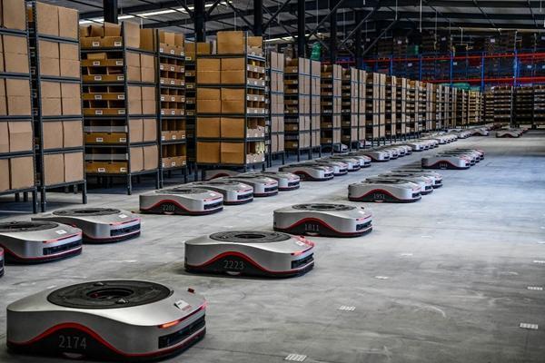 西藏拉萨的自治区级公共物流仓储配送中心内,AGV机器人排列在货架前。受访者供图