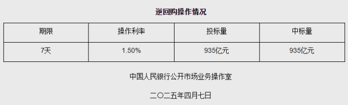 据央行网站消息,2025年4月7日中国人民银行以固定利率、数量招标方式开展了935亿元逆回购操作。具体情况如下: