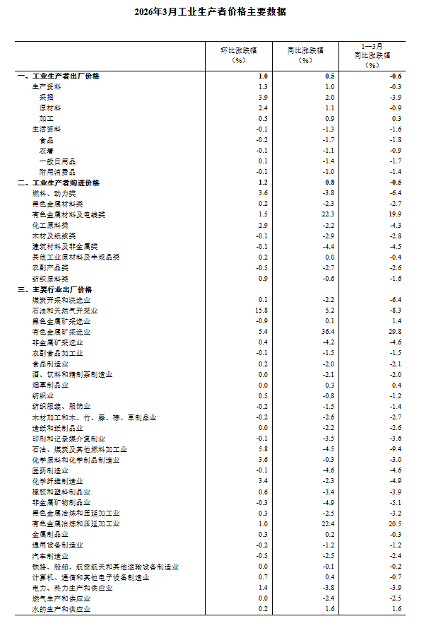 2026年3月份,全国工业生产者出厂价格同比由上月下降0.9%转为上涨0.5%;环比上涨1.0%,涨幅比上月扩大0.6个百分点。工业生产者购进价格同比由上月下降0.7%转为上涨0.8%;环比上涨1.2%,涨幅比上月扩大0.5个百分点。一季度,工业生产者出厂价格比上年同期下降0.6%,工业生产者购进价格下降0.5%。