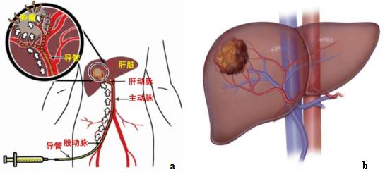 我们知道,人体的各个器官,都需要血液提供营养,而肝癌同样需要血液提供营养。TACE是在X线透视下,通过穿刺股动脉或桡动脉,将导管沿着血流管道插到腹腔干动脉直至肝动脉,然后通过肝动脉向肿瘤营养动脉注入化疗药物及栓塞剂,发挥阻塞血管及局部化疗作用,“断其粮道,饿死肿瘤”,导致肝脏肿瘤坏死(如图1a所示)。TACE为了杀死肿瘤细胞,把肝脏的动脉血管堵上了,正常肝脏不会缺血坏死而受影响吗?实际上,TACE治疗肝癌的核心原理是肝脏具有肝动脉和门静脉双重供血,肝癌组织的血供95%以上来自肝动脉,而正常肝脏组织的血供70%-75%来自门静脉,因此,栓塞供应肝癌组织的肝动脉分支可有效阻断肿瘤的血供并使其缩小坏死,而对正常肝脏组织影响较小(如图1b所示)。
