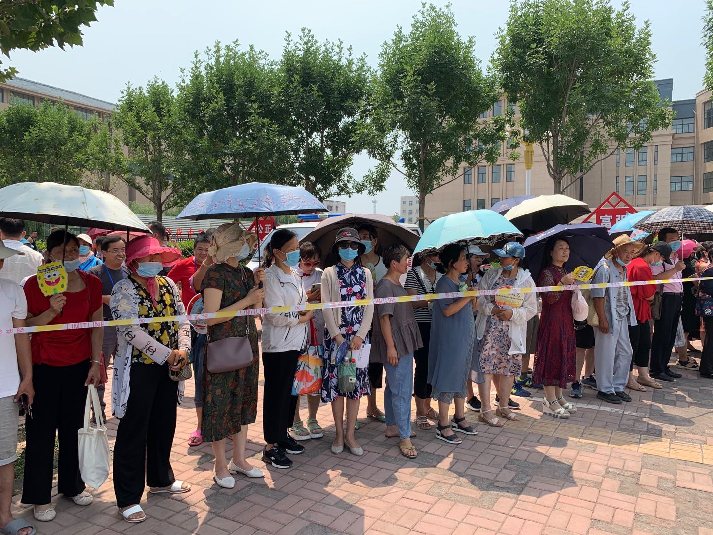 7月7日,高考首日,从早晨7时开始,菏泽二中考点外便人头攒动,大批考生、家长自觉佩戴口罩赶到这里,家长们对孩子进行简单叮嘱后目送他们走进考点,然后前往等候区静静等待。由于疫情防控需要,考生进入考点时需要接受体温检测等程序,许多家长则在考点外密切关注着孩子进考点的情况。