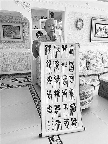 彭忠的字不归派、不归体,随手就写。退休后,他受邀到尧王书法研究院担任秘书长,那些年,他接触了一些书法名家,开始深入研究书画,也感受到了中华文化的博大精深。“一个字有多种写法和多种意义,我接触书法后感受到古人造字的奥妙。”彭忠说,此后,他便更加投入地学习书法。