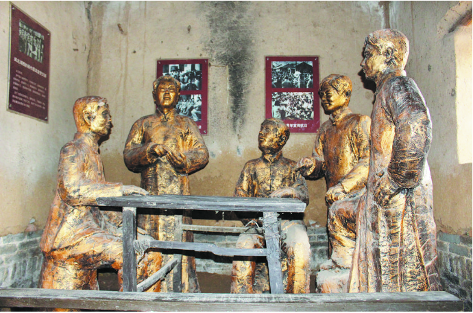 袁心来兴致勃勃地带领记者参观村里的金曹县抗日民主政府旧址。高大古槐掩映下的古朴院落,显得格外幽静。走进修缮的老屋里,一座铜色群雕首先映入眼帘,5个壮实人物的英雄形象,令人肃然起敬,或讲述、或聆听、或沉思,无所畏惧、豪迈坦荡的神情凝在聚每个人物的脸庞。袁心来讲解道:“这是中共单东北第一个农村党支部成立的地方,再现的是杨作磊家庭党支部会议的情景,站着讲话的就是党组织的创始人杨作磊……”