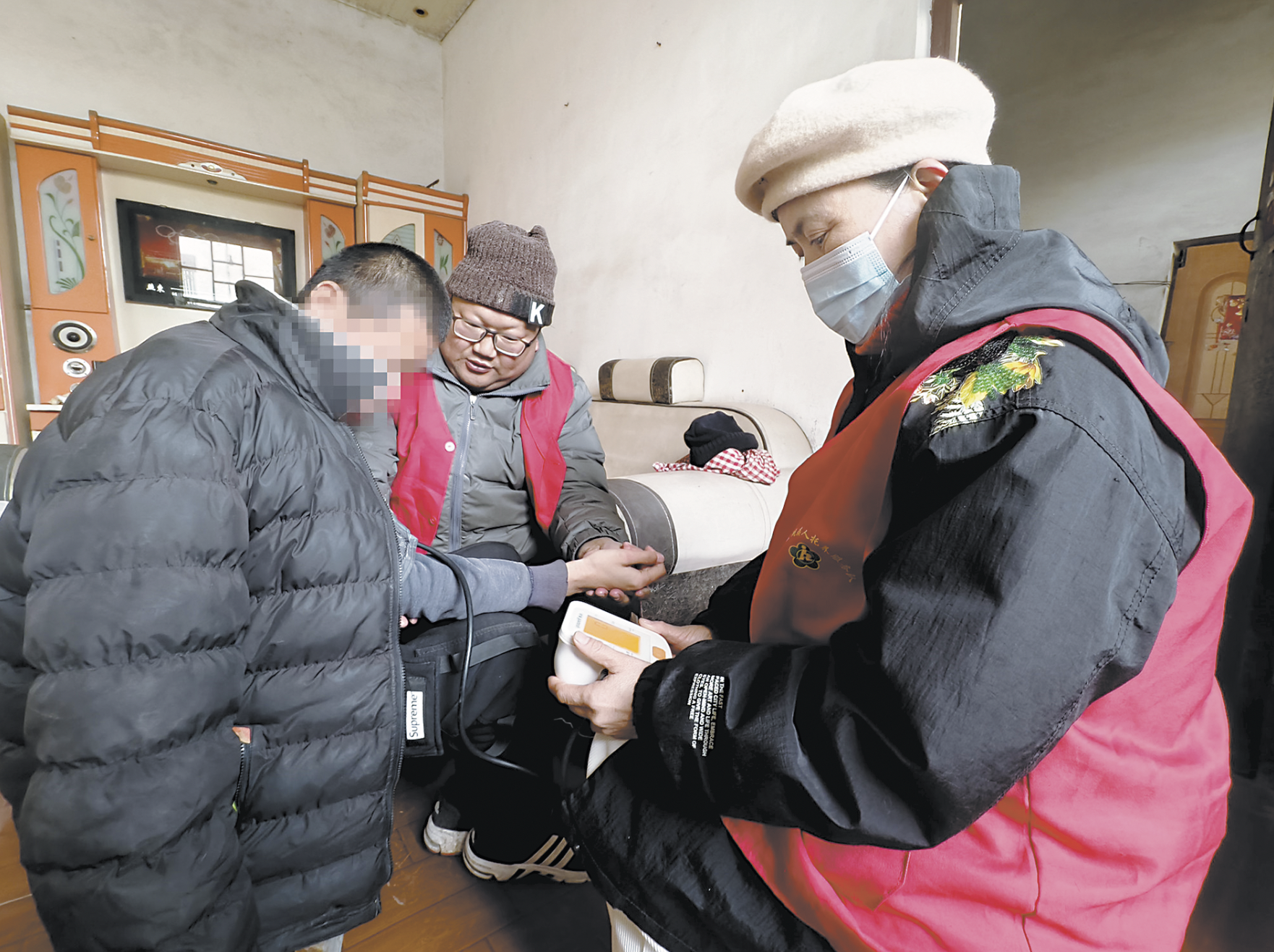 “光光,最近怎么样?咱们脱掉这个胳膊上的外套,我给你测量血压。”12月19日,牡丹区残疾人托养服务队队员王雷、李秋芹挎着工具包,轻车熟路地走进残疾人李光家,热情地打招呼后,就麻利地忙了起来。